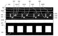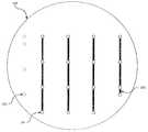 도 4b 는, 도 4a 의 평면과는 전기 절연층에 의해 분리된 평면을 도시한 도면으로, 전력 공급 라인들은 비아들을 통하여 이 평면 내의 리드들에 접속되고, 냉각판 (미도시) 내의 단일 홀에 이르게 된다.     이 평면 상의 전력 복귀 라인들은 이 평면과 도 4a 의 평면 사이에서 연장된 비아들을 통하여 히터존들에 접속된다.     전력 복귀 라인들은 또한 냉각판 (미도시) 내의 단일 홀에 이르게 된다.