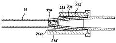 이제, 도 8a 내지 8d를 보면, 인-라인 교합기(in-line occluder) 즉 튜브를 닫도록 조이는 대신 튜브의 내부를 배치함으로써 유동을 차단하는 교합기의 사용을 포함하는 교합기 메커니즘의 구체예가 도시된다. 특히, 도 8c를 보면, 교합기(226)가 튜브의 내부에 배치된 주입 세트의 튜브(14)의 횡단면도가 도시된다. 상기 교합기(226)는 통상 튜브의 내측 직경보다 약간 더 큰 외측 직경을 가진 스톱(230)을 포함한다. 상기 스톱(230)은 유동 채널이 상기 스톱을 지나 개방되지 않는 한 튜브를 통한 유체 유동을 차단한다. (이러한 교합기의 더욱 상세한 내용은 미국특허번호 7,150,727호에 설명되는데, 이 특허는 본 명세서에서 참고문헌으로 통합된다). 유동 채널이 개방될 때, 유체는 스톱(230)을 지나, 주입 라인의 부착 부분들을 위한 커넥터로서 사용될 수 있는 바디(236) 내의 개구(234) 내로 흐른다. 일단 스톱(230)을 지나면, 유체는 바디 내의 채널을 통하여 주입 세트의 나머지 부분을 통해 하류로 자유로이 이동된다.Turning now to Figures 8a-8d, an embodiment of an articulator mechanism is shown that includes the use of an articulator to block flow by placing an in-line occluder, i.e., the interior of the tube instead of tightening to close the tube. 8c, there is shown a cross-sectional view of an infusion set of