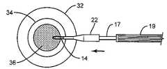 블록(65)에서 볼 수 있는 바와 같이, 가열 요소가 전낭에 대해 정확히 위치된 후 가열 요소는 전류의 인가에 의해 통전되어, 루프가 가열되어 전낭을 "연소"시킨다.  전낭의 연소가 완료되면, 가열 요소는 블록(66)에서 볼 수 있는 바와 같이, 삽입 카트리지 내로 철회될 수 있고 블록(67)에서 볼 수 있는 바와 같이, 눈으로부터 제거될 수 있다.As can be seen in