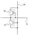 비선형 소자(30)의 제 1 단자(게이트)와 제 3 단자(드레인)는 주사선(13)에 접속되고, 비선형 소자(30)의 제 2 단자(소스)는 공통 배선(29)에 접속된다. 비선형 소자(31)의 제 1 단자(게이트)와 제 3 단자(드레인)는 공통 배선(29)에 접속되고, 비선형 소자(31)의 제 2 단자(소스)는 주사선(13)에 접속된다. 즉, 도 2에 예시된 보호 회로는 정류 방향들이 주사선(13)에 대해 서로 반대이고 주사선(13)과 공통 배선(29)을 서로 접속하는 2개의 트랜지스터들을 포함한다. 즉, 주사선(13)과 공통 배선(29) 사이에, 정류 방향이 주사선(13)으로부터 공통 배선(29)인 트랜지스터와 정류 방향이 공통 배선(29)으로부터 주사선(13)인 트랜지스터가 존재한다.The first terminal (gate) and the third terminal (drain) of the