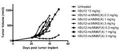 도 12는 SCID 마우스의 DoHH2 종양 모델에서 항-CD19 항체-약물 접합체의 항종양 활성이다.  마우스의 그룹들(1/그룹)을 1 ㎎/㎏, 3 ㎎/㎏ 또는 10 ㎎/㎏의 hBU12-vcMMAE4, -mcMMAF4 및 -mcMMAF8로 다양하게 처리하였다.  용량 스케줄은 단일 용량, ip이었다.