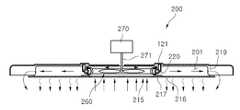 상기 컨벡션히터(220)는, 1개의 히터브라켓(230) 및 적어도 1개의 히터서포터(240)에 의하여 상기 컨벡션챔버(201)의 내부에 고정된다.  본 실시예에서는, 상기 컨벡션히터(220)의 고정을 위하여 2개의 상기 히터서포터(240)가 사용되지만, 그 이하 또는 이상의 개수의 상기 히터서포터(240)가 사용될 수도 있다.The