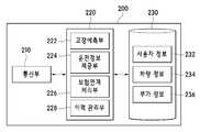 차량 정보(234)는 상기 사용자 정보(232)에 등록된 사용자의 차량 정보이다. 즉, 이러한 차량 정보(234)는 차량 단말기(100)가 설치된 차량을 식별하기 위한 정보와 상기 차량 단말기(100)로부터 수집되고 고장예측부(222) 또는 운전정보 제공부(224)에서 분석된 정보일 수 있다. 예를 들면, 차량 정보(234)는 상태 정보, 운행 정보, 및 고장예측 정보를 포함할 수 있다.The