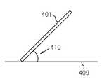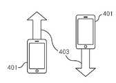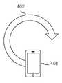 도 5a는 휴대형 전자기기(401)를 들고 있는 상태에서 지면과의 직교축(407)을 기준으로 하여 좌 또는 우로 기울일 때에 기울임 각도(408)가 인증에 사용할 제스처로 입력되는 예이며, 도 5b는 휴대형 전자기기(401)를 지면(409)에 완전히 눕히지 않고 비스듬히 눕혀서 눕힘 각도(410)가 인증에 사용할 제스처로 입력되는 예이다.5A is an example in which the