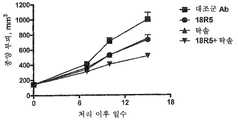 도 11.  18R5 및 이리노테칸의 조합물 처리에 의한 OMP-C28 이종이식 종양 성장의 감소.  NOD/SCID 마우스에 10,000개의 OMP-C28 결장 종양 세포를 주사하고, 24 일째에 평균 종양 부피가 129 mm3인 마우스를 무작위화하고, 나타낸 처리를 개시하였다.  종양 성장을 매주 모니터링하였다.  18R5로 처리한 동물에서 종양 성장이 현저하게 감소되었다.  또한 18R5 및 이리노테칸의 조합물은 어느 하나의 작용제를 단독 처리한 것에 비해 현저하게 감소시켰다.