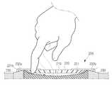 본 발명의 실시예에 따른 터치부(210, 220)는 테두리부(230)와의 경계선 보다 낮은 부분을 포함할 수 있다. 즉, 터치부(210, 220)의 터치면이 터치부(210, 220)와 테두리부(230)의 경계선 보다 낮게 위치할 수 있다. 일 예로, 터치면이 테두리부(230)와의 경계선에서부터 아래로 경사지도록 마련되거나, 테두리부(230)와의 경계선과 단차를 두고 위치할 수 있다.The