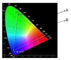색재현율에 대해 좀 더 자세히 설명하면, 색좌표 상에 결정된 적(R), 녹(G), 청색(B) 각각의 색좌표를 연결하면 삼각형의 면적을 산출할 수 있고, 색재현율은 위의 면적을 NTSC(국제 TV 표준 위원회) 색좌표의 면적과 비교하여 산출할 수 있다.More specifically, the color reproduction ratio can be calculated by connecting the color coordinates of each of red (R), green (G) and blue (B) determined on the color coordinate system. It can be calculated by comparing with the area of the NTSC (International TV Standards Committee) color coordinate.