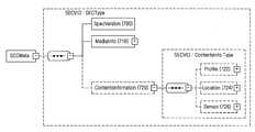 상기 도 7을 참조하면, 본 발명에 따른 상기 meta 컨테이너(620)는 스펙 버전(SpecVersion)(700), 미디어 정보(MediaInfo)(710) 및 컨텐츠 정보(ContentsInformation)(720)를 포함하여 구성된다. 상기 스펙 버전(700)은 해당 미디어 파일이 지원하는 MP4 스펙의 버전을 나타내며, 미디어 정보(710)는 미디어 파일의 부가 정보들을 대표하는 정보를 나타내고, 상기 컨텐츠 정보(720)는 상기 미디어 파일을 구성하는 각 세그먼트에 대한 부가 정보를 나타낸다. 여기서, 실선으로 표시된 정보는 상위 노드에 대하여 필수적으로 포함되어야 할 정보이며, 점선으로 표시된 정보는 상위 노드에 대하여 선택적으로 포함될 수 있는 정보를 나타낸다. 즉, 상기 미디어 정보(710)는 상기 미디어 파일을 대표하는 부가 정보를 나타내므로 상기 meta 컨테이너(620)에 필수적으로 포함되어야 하는 반면, 상기 컨텐츠 정보(720)는 상기 미디어 파일을 구성하는 각 세그먼트에 대한 정보를 나타내므로 상기 meta 컨테이너(620)에 포함되지 않을 수도 있고, 상기 미디어 파일을 구성하는 세그먼트 수에 대응하는 수만큼 포함될 수도 있다.7, the