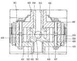 상기 축부(310)의 상단은 상기 어큐뮬레이터(500)의 어큠공간(501) 안으로 삽입되는 반면 상기 축부(310)의 하단은 상기 상부베어링(420)과 하부베어링(430)을 반경방향으로 지지하도록 그 상부베어링(420)과 하부베어링(430)을 축방향으로 관통하여 회전 가능하게 결합된다.The upper end of the