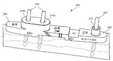 개구들(210)은 도 12에 도시된 바와 같은 가이드 와이어(240) 및/또는 그곳을 관통하는 드릴 팁(tip)을 수용하는 크기와 모양을 가진다. 드릴 템플릿(200)은 제1 표면(206)으로부터 개구들(210)의 각각을 기준으로 연장하여 개구들(210)에 삽입되는 가이드 와이어(240)의 길이를 따라 더 큰 지지력을 허용하는 돌기들(212)을 더 포함한다. 가이드 와이어(240)는 그 원위단에서 드릴 팁(242)을 포함할 수 있으므로, 개구들(210)을 관통하여 가이드 와이어(240)의 삽입에 의해 뼈에 구멍들이 천공될 수 있다. 드릴 템플릿(200)은 제2 표면(108)을 따라 함몰된 언더컷(214)을 더 포함할 수 있으므로, 드릴 템플릿(200)은 쏘(saw)(250)를 드릴 템플릿(200)에 접촉시키지 않으면서 그 위에 위치되어 있는 동안 뼈를 완전히 제거한다. 언더컷(214)의 측면에서, 드릴 템플릿(200)은 절단되어 질 뼈의 위치를 나타내는 마킹들(218)(220)을 포함한다. 예를 들어, 제1 마킹(218)은 실질적으로 횡단 컷(예, 뼈의 세로축에 실질적으로 수직되는)을 나타내는 반면 제2 마킹(220)은 뼈의 세로축에 대해 필요한 각도(예, 45°)의 컷을 나타낸다. 따라서, 드릴 템플릿(200)은 쏘(250)를 위한 가이드를 제공할 수 있으므로, 뼈의 횡단 컷을 제공하기 위해 사용될 때 블레이드가 마킹(218)과 실질적으로 정렬되어 있기 때문에 별도의 쏘 가이드가 불필요할 수도 있다. 쏘 가이드(222)와 결합하여 드릴 템플릿(200)을 사용할 필요가 있는 경우, 아래에서 더 상세히 설명되는 바와 같이, 드릴 템플릿(200)은 쏘 가이드(222)의 일 부분을 수납하기 위해 제1 표면(206)을 따르는 그루브(215)를 포함할 수 있다.The
