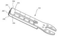 예시적인 외과적 수술법에 따르면, 도 17 내지 도 23에 도시된 바와 같이, 컷(cut)이 뼈에 만들어짐으로써, 뼈는 플레이트(100)를 이용하여 고정될 수 있다. 도 17에 도시된 바와 같이, 드릴 템플릿(200)은 뼈를 따라 바람직하게, 뼈(예, 척골)의 1/3 원위 방향의 중간의 내측 가장자리를 따라 위치될 수 있으므로, 드릴 템플릿(200)의 원위단(204)은 뼈의 원위단과 면하고 근위단(202)은 뼈의 근위단에 면한다. 드릴 템플릿(200)은 2개 또는 그 이상의 개구들(210)을 통해 삽입된 가이드 와이어(240)를 통해 뼈에 고정될 수 있다. 가이드 와이어(240)는 드릴 팁(242)을 통해 뼈를 따르는 상응한 위치에서 구멍을 천공하는 방식으로 삽입된다. 이러한 사전-천공(pre-drilling)은 뼈가 전달된 후 뼈의 적정한 정렬을 용이하게 하는 것을 당업자는 이해할 것이다. 도 18에 도시된 바와 같이, 사용자가 뼈를 횡단으로 관통하는 컷을 만들기 원하는 경우, 쏘(250)의 제1 및 제2 블레이드들(252)(254)은 드릴 템플릿(200)에 표시된 제1 마킹(218)과 정렬된다. 그러나, 도 19에 도시된 바와 같이, 사용자가 경사 컷을 만들기 원하는 경우, 사용자는 각진 표면(224)을 제2 마킹(220)에 정렬시켜 쏘 가이드(222)를 드릴 템플릿(200)에 부착함으로써 쏘(250)는 그곳을 따라 미끄러질 수 있다.According to an exemplary surgical procedure, as shown in Figs. 17-23, a cut is made on the bone, so that the bone can be fixed using the