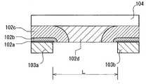 도 5b에 도시되는 FET의 오프 전류는, 제1 도체 전극(103a)과 제2 도체 전극(103b) 사이의 중간 영역에 형성되는 영역(102e)에 의해 결정된다.  한편, 제1 도체 전극(103a)과 게이트(105)가 서로 겹치는 부분, 제2 도체 전극(103b)과 게이트(105)가 서로 겹치는 부분, 및 이 부분들의 주변 영역은, 오프 전류의 감소에 거의 영향을 미치지 않는 것을 알았다.The off current of the FET shown in Fig. 5B is determined by the
