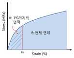 A는 응력-변형률 곡선에서 변형률 0 내지 1% 구간의 면적을 나타내고,A represents the area of 0 to 1% strain in the stress-strain curve,