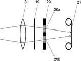 이상의 구성에 의해, 입사광은, 렌즈(3), 렌즈 조리개(19) 및 광속 제한판(20)을 투과하여, 감광 필름(21)에 결상한다.  이 때, 광속 제한판(20)에 있어서의 2개의 색 필터(20a, 20b)에서는, 각각 적색 계통, 청색 계통의 광만이 투과한다.  그 결과, 감광 필름(21) 상에는 이들 2개의 색 필터를 각각 투과한 광에 의한 마젠타 계통의 색 성분의 상(像)이 형성된다.  여기서, 색 필터(20a, 20b)의 위치가 다르기 때문에, 감광 필름(21) 상에 형성되는 상에는 시차가 생긴다.  여기서, 감광 필름으로부터 사진을 만들어서, 적색 필름 및 청색 필름이 각각 우안용 및 좌안용으로서 부착된 안경을 사용하면, 깊이감이 있는 화상을 볼 수 있다.  이와 같이, 특허문헌 1에 개시된 기술에 의하면, 2개의 색 필터를 사용하여 복수 시점 화상을 만들 수 있다.With the above arrangement, the incident light passes through the