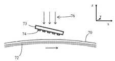 마스크에서 소형 패턴으로부터 대형의 고해상도 격자 패턴을 인쇄하기 위한 포토리소그래피 방법은 E. Gamet 등의 "긴 초미세 기간 스티치없는 격자의 인쇄를 위한 비행 위상 마스크(Flying phase mask for the printing of long submicron-period stitch-less gratings)", Microelectronic Engineering 83 (2006) 734-737, 및 Jourlin 등에 의한 국제 특허 출원 WO 2010/060741 A1호에 기재되어 있다. 이러한 스키마에 따르면, 비교적 작은 영역의 격자를 지지하는 위상 마스크는 포토레지스트 층이 코팅된 보다 큰 기판에 근접하여 상기 기판과 평행하게 위치된다. 상기 마스크를 강도가 변조된 레이저 빔으로 조사하면서 격자 라인과 직교하는 방향으로 상기 마스크에 대하여 측방향으로 기판을 병진시킴으로써 노광이 수행된다. 변조 주파수는 변위 속도와 동기화되어서 상기 기판은 연속적인 조사 펄스 사이에서 상기 격자의 주기에 대응하는 거리만큼 변위되고, 이에 의하여 연속적인 펄스에 의해 상기 마스크로부터 투사된 인터페로그램에서의 강도 최대치가 기판에 중첩된다. 상기 변조 주파수가 요구되는 정확도와 동기화되는지를 확인하기 위하여 인코더 기반의 광학 시스템이 기판 변위 속도를 측정하는데 추가적으로 활용된다. 또한, 센서는 변위 동안에 스테이지의 가능한 요(yaw)를 측정하기 위하여 통합되어 상기 기판의 병진 시에 위상 마스크의 방향을 약간 조정하는 틸트 액츄에이터에 의해 보상될 수 있다. 이러한 사실은 상기 마스크가 0번째 및 두개의 1차 회절 차수가 발생되는 수직 입사로 또는 상기 0번째 및 하나의 1차 차수만이 전파하도록 리트로 각도(Littrow angle)로 조사될 수 있는 것을 더 설명한다.A photolithographic method for printing a large, high resolution grid pattern from a small pattern in a mask is described in E. Gamet et al., "Flying phase mask for printing a long submicron period stitchless grid stitch-less gratings ", Microelectronic Engineering 83 (2006) 734-737, and International Patent Application WO 2010/060741 Al by Jourlin et al. According to this scheme, a phase mask that supports a relatively small area of the grating is positioned parallel to the substrate close to the larger substrate coated with the photoresist layer. Exposure is performed by irradiating the mask with an intensity-modulated laser beam and translating the substrate laterally with respect to the mask in a direction perpendicular to the grating lines. The modulation frequency is synchronized with the displacement rate so that the substrate is displaced by a distance corresponding to the period of the grating between consecutive irradiation pulses so that the intensity maximum in the interferogram projected from the mask by successive pulses, . An encoder-based optical system is additionally utilized to measure the substrate displacement rate to ensure that the modulation frequency is synchronized with the required accuracy. The sensor may also be compensated by a tilt actuator that is integrated to measure the possible yaw of the stage during displacement to slightly adjust the direction of the phase mask during translation of the substrate. This fact further explains that the mask can be illuminated with a Littrow angle such that only the 0th and 1 < st > order orders propagate to the normal incidence where the 0 < th > .