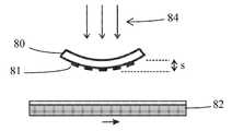 본 실시예의 변형에서, 도 5를 참조하면, 그 상면에 감광층을 갖는 유연성 필름(70)은 xz 평면에서 만곡되어 있지만 직교 평면에서 대략 평탄한 원통형 곡면과 같은 만곡 지지부(72)의 표면에 롤투롤 기구(미도시)에 의해 가이드된다.  피처의 주기 패턴(74)을 지지하는 마스크(73)는 만곡 지지부(72) 위에 위치된다.  위치결정 시스템은 마스크에서 패턴 직하의 필름에 대하여 xz 평면에서 각도로 마스크를 틸팅시켜 상기 마스크를 위치시키고, 이에 따라 상기 패턴(74)의 중심은 필름(70)으로부터 요구되는 분리를 갖는다.  이전의 실시예에서 설명된 이러한 유형의 조사 시스템은 마스크 패턴(74)을 노광시키기 위하여 콜리메이트 광선(76)을 발생시킨다.  상기 필름이 노광 시에 마스크 아래에서 병진되므로, 상기 가이드 기구는 만곡 지지부(72)에서와 같은 가벼운 장력 하에서 상기 필름(70)을 유지시켜, 노광되어 있는 필름의 부분에 대한 마스크 패턴의 틸트 각도와 분리는 계속해서 대략 일정하게 남게 된다.  유사하게, 이러한 정렬은 상기 필름(70)이 노광 시에 마스크(73)에 대하여 정확하게 위치되어 상기 감광층이 탤벗 평면 사이에서 횡방향 강도 프로파일의 요구되는 적분에 정확히 노광되는 것을 가능하게 하는 역할을 한다.5, the