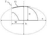 도 2a를 참조하면, 제1출사면(13)은 광축(Z)과 이 광축(Z)에서 소정 거리(W) 이격된 위치까지 형성되는 면으로, 두개의 초점이 존재하는 타원 형상으로 형성될 수 있다.  즉 제1출사면(13)은 상기 제2볼록부(14)와 인접한 위치에서부터 소정 거리(W) 이격된 위치까지 형성되는 것으로, 장축 a와 단축 b를 가진다. 단축 b는 소정 거리(W) 이격된 위치에서 광축(Z)과 나란하게 형성될 수 있다.  여기서, 장축 a는 소정 거리 W 보다 두배 이상의 길이를 가지며, 렌즈 본체(10)의 높이 H의 두 배 길이를 가질 수 있다.2A, the