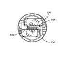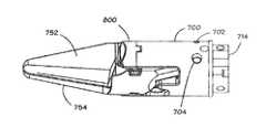 이등분 평면에 인접하여 편향력을 적용하는 것은 이용가능한 공간을 제한하는 클레비스의 작은 크기 및 원통 모양 때문에 유익할 수 있다.  이등분 평면에 인접하여 편향력을 적용하면 2개의 턱(752, 754)의 작동부(802, 812)가 서로를 향해서 강제로 모이게 되고, 부분(804, 814)들은 서로로부터 멀어지면서 선회된다.  클레비스(700)는 피벗(702, 704)에서 내부를 향한 반응력을 제공하며, 이것은 2개의 턱(752, 754)의 선회부(804, 814)에 적용되는 외부를 향하는 힘을 상쇄한다.  피벗(702, 704)에 인접한 클레비스의 제1 단부(714)는 휨 없이 내부를 향한 반응력을 제공할 수 있는 강도 및 강직성을 지닌 완전한 원통형 구조를 제공한다.  2개의 턱(752, 754)을 수용할 수 있도록 클레비스의 일부가 절단되어 있는 캡(800)에 인접한 클레비스의 더 얇은 구조는 편향 스프링(852, 854)으로부터 휨 힘을 받지 않는다.Applying the biasing force adjacent the bisector plane may be beneficial because of the small size of the clevis and the cylindrical shape that limits the available space. Applying a biasing force adjacent the bisector plane forces the actuating