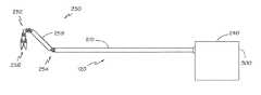 도 2는 기다란 튜브(210)에 의해서 연결된 원위부(250)와 근위 제어 메커니즘(240)을 포함하는 수술 기구(120)의 예시적인 구체예의 평면도이다.  바람직하게 수술 기구(120)는 기다란 튜브형 부재(210)에 의해 지지되는 절단 수단(256)을 제공하며, 이 부재는 수술 과정이 비교적 국한된 영역에서 착수될 수 있도록 한다.  수술 기구(120)의 원위부(250)는 바람직하게는 단부 작동기로서 전단기(256)를 제공한다.  도시된 구체예에서, 전단기(256)는 튜브형 구획(258)에 의해 연결된 2개의 관절화된 구획인 "리스트"(252)와 "조글 조인트"(254)에 의해 기다란 튜브(210)에 연결되며, 이들은 수술 도구의 위치와 방향이 조작될 수 있도록 한다.2 is a plan view of an exemplary embodiment of a