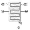 도3b는 실시예에 따른 압력 전극(400)의 구조를 예시한다. 압력 전극(400)은 예컨대 압력 구동전극(400-1)과 압력 수신전극(400-2)을 포함하여 구성될 수 있다. 다시 도3a에서, 거리(d)가 가까워짐에 따라 프린징(fringing) 현상에 의해 압력 구동전극(400-1)과 압력 수신전극(400-2) 사이에 생성되는 압력 캐패시터(401: Cp)의 정전용량 값이 감소할 수 있다. 압력 전극(400)이 기준 전위층(300)과 가까워질수록 압력 구동전극(400-1)과 압력 수신전극(400-2) 사이에 생성된 프린징 필드(fringing field)가 기준 전위층(300)으로 빼앗기는 구조이므로, 거리(d)가 감소함에 따라 압력 캐패시터(401)이 감소할 수 있다.3B illustrates the structure of the