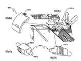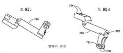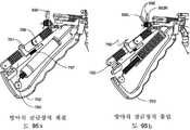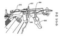 도 92 내지 도 102는 가이드(120, 130)에 대한 조작 및 제어, 및 방아쇠(700)에 대한 잠금 메커니즘의 양태를 예시한다. 핸들(892)을 회전시켜 가이드(120, 130)가 전개되거나 빠진다. 케이블(172-178)은 하우징 구성성분(612, 614)에 의해 제자리에 고정된 가이드(885) 위로 라우팅(routing)되고 와이어의 2개의 쌍으로 분할되고, 1개 세트의 와이어가 스프링 로딩된 활차(894a, 896a) 주위에 아래로 방향지시되고 핸들(192)에 라우팅된다(여기서, 모든 4개의 케이블(172, 174, 176, 178)이 테이퍼드 핀(893)에 의해 핸들(892)에서의 개구(892b) 내 제자리에 고정됨). 케이블의 다른 쌍이 핸들(892)에 직접적으로 가이드(887) 주위에 라우팅된다. 가이드(885)(도 93(B))는 복수의 케이블 가이드(885a)를 갖는 대체로 곡선 평면 멤버이고, 케이블(172-178)은 핸들(892)로의 이의 라우팅 시 이의 상면을 지탱한다. 도 93(A)는 핸들(600)의 다른 내부 구성성분과 관련하여 동일 자리에서의 가이드(887 및 885)를 예시한다. 가이드(887)(도 93(C) 내지 도 93(D))는 하우징 부분(612, 614)이 수용하는 보스(887a) 및 케이블/와이어를 라우팅하기 위한 핀(887c)에 의해 획정된 홈(887b)을 포함한다. 핸들(892)은 그립(892a) 및 홈(892c), 및 케이블/와이어를 개구(892b)로 방향지시하기 위한 채널(892d)을 포함한다(도 94(A) 내지 도 94(E)). 핸들(892) 둘 다 실질적으로 동일한 형태이다.92 to 102 illustrate aspects of the operation and control of the