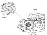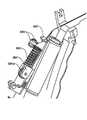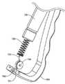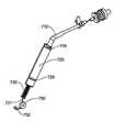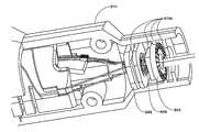 도 103 내지 도 113은 왕복하는 방아쇠 메커니즘(700)의 조작의 양태를 예시한다. 도 103은 방아쇠(700), 풀 케이블/리본(710), 방아쇠 스프링 캡슐(720), 방아쇠 리턴 스프링(730), 풀 케이블(727) 및 활차(750)의 상대 위치를 예시한다. 도 103은 구성성분(786, 787) 및 핸들(700)을 제거하여 풀 케이블(727)의 말단부 말단에 고정되고 핸들(700) 내의 개구(701) 내에 있는 페룰(752)을 나타낸다(도 105). 방아쇠(700)는 2개의 추가의 각도로부터 도 106(A) 내지 도 106(B)에 추가로 예시되어 있고, 방아쇠(700)의 상부 말단에 근접한 분기된 요크(702)를 나타낸다. 간섭 피트 및/또는 초음파 용접, 접착제 등에 의해 스터드(stud)(704a)를 홀(700a)로 고정하여 요크 캡(704)은 방아쇠 핸들(700)에 수용된다. 요크(702) 및 요크 캡(704)은 셔틀 링크(888)의 보스(888a)를 수용하기 위해 내부의 개구(702a, 704a)를 획정한다(도 99(B)). 도 107a는 캡슐(720)의 내부를 예시하고, 클러치 스프링(724)을 나타낸다. 도 107b 내지 도 107c는 하우징 부분(720b)과 일치하는 하우징 부분(720a)을 예시한다. 하우징 부분(720b)은 부분(720a)의 동일한 거울상이여서, 오직 720a가 예시되어 있다. 클러치 스프링(724)이 도 108에서 제거되어, 풀 케이블(727), 클러치 스프링 페룰(723) 및 클러치 세척기(726)를 명확히 예시한다. 도 109는 스프링(730) 및 하우징 부분(720b)이 제거된 어셈블리를 예시한다. 도 110은 어셈블리(720)에 대한 드라이브 멤버(710)의 연결의 확대를 예시하고, 드라이브 멤버(710)의 근위 말단에서 탭(711, 712)이 구부러지고 세척기 판(721)에서 슬롯(721a)을 통해 삽입되는 방식을 보여준다. 실리콘 또는 다른 적합한 물질일 수 있는 O 고리(720)가 도 104 및 도 109에 예시되어 있다. O 고리(729)는 하우징 분절(612, 614)에 대한 시일을 제공한다. 페룰(723)은 케이블(727)에 고정된다. 도 111 내지 도 113은 각각 페룰(723), 세척기 판(721) 및 멤버(710)의 근위 말단의 확대도를 제공한다.Figures 103 to 113 illustrate aspects of the operation of the