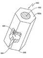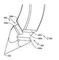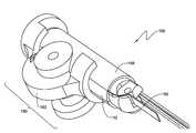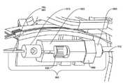 도 56 내지 도 59는 장치(1000)의 중간부(500)의 양태를 예시한다. 중간부(500)는 근위 말단 및 원위 말단(514)을 갖는 긴, 바람직하게는 금속 관(510)을 포함한다. 관(510)의 원위 말단(514)은 너클 어셈블리(knuckle assembly)(520)에 부착되어, 결국 피벗(114)에서 봉합 헤드(110)에 회전축으로 부착된다. 활차(pulley)(515)는 인접한 아티큘레이션 케이블(articulation cable)(532, 534)에 대한 지탱 표면으로서 작용하도록 피벗(114)에 위치하고, 케이블(532, 534)은 바람직하게는 활차(515)에 부착되어 아티큘레이션을 실행하기 위한 영향력을 제공한다. 아티큘레이션 케이블(532, 534)은 임의의 적합한 형태를 취할 수 있고, 가장 바람직하게는 직경. 020"의 멀티-스트랜드 300 시리즈 스테인레스 강 케이블이다. 아티큘레이션 케이블 중 하나에서 당겨, 봉합 헤드(100)는 피벗(114) 주위의 중간부(500)에 대해 아티큘레이션된다. 너클(520)은 중간부(526)에 의해 분리된 근위 말단(522) 및 원위 말단(524)(봉합 헤드(100)를 수용하기 위한 요크(yoke)(524a, 524b) 형태)를 포함한다. 중간부(526)는 드라이브 멤버(150)를 수용하기 위한 세로 채널(528)을 획정한다. 바람직하게는, 멤버(150)는 이 영역에서 풀 봉(151)에 부착되고, 채널(528)의 횡단면 프로파일은 도면에 도시된 바대로 이러한 기하구조를 수용하기에 적합하다. 개구(523)는 또한 멤버(532, 534)를 수용하도록 획정된다. 게다가, 개구(525, 527)는 또한 가이드(120, 130)의 이동을 제어하기 위한 풀 와이어/케이블(172, 174, 176, 178)의 통로를 허용하도록 제공된다. 관형 멤버(510)의 근위 말단은 하기 기재된 상기 장치의 핸들(600)에 대해 관(510) 및 봉합 헤드(100)를 회전시키는 로티큘레이션(roticulation) 메커니즘에 부착된다. 관(510)의 원위 말단(514a)은 드라이브 부재(150)가 중간부(500)로 통과하면서 이의 더 단단한 제어를 제공하도록 약간 확장될 수 있다.FIGS. 56-59 illustrate aspects of the