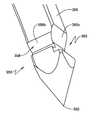 도 86(A) 내지 도 86(B)는 방아쇠(700)가 풀릴 때 근위로 이동하는 셔틀(888)의 이동을 예시한다(도 99(A) 내지 도 99(B)). 셔틀(888)의 근위 이동은 핸들(892r)이 아티큘레이션되는 것을 막아, 결국 가이드(120, 130)가 봉합 헤드(100, 100')로 빠지는 것을 막고, 방아쇠(700)가 액츄에이팅되어 원형 니들 트랙(140, 140') 주위로 니들(예를 들면, 300)을 전진시킨다. 하부 브레이크 패드(850)를 더 잘 예시하기 위해 구성성분(830, 835)은 도 86에서 제거된다. 브레이크 패드(820, 850)는 바람직하게는 탄성 및 다소 압축성 물질, 예컨대 실리콘으로부터 제조된다. 도 87(A)는 하부 브레이크 패드(850)를 추가로 예시하고, 도 87(B) 내지 도 87(D)는 브레이크 받침대(860)를 예시한다. 받침대(860)는 하부 브레이크 패드(850)를 수용하기 위한 위의 원형 보스(862), 및 브레이크 핸들 구성성분(882, 884, 884a)을 획정한다(도 91b)). 도 88 내지 도 89(a)는 브레이크 패드가 제거되고(도 88), 활차 홀더(840) 및 브레이크 받침대(860)가 추가로 제거된 핸들의 남은 내부 작업을 예시한다. 도 89(a) 내지 도 89(b)는 케이블(532, 534)의 통과를 허용하기에 충분히 넓지만, 케이블 말단부(874)의 통과를 허용하기에 충분히 넓지 않은 좁은 부분(872c)을 갖는 세로 개구(872a)를 포함하는 커플링 너클(872)을 추가로 예시한다(도 91). 개구(872b)는, 반대로 말단부(874)가 너클(872)로 통과하기에 충분히 커서, 케이블(532)이 케이블(534)에 접합하고, 아티큘레이션 및 브레이크 제어(800)에 의해 아티큘레이션을 수월하게 하는 밀폐 루프를 제공한다. 브레이크 방아쇠(884)를 당겨, 핸들 구성성분(882)의 상부 부분(및 상기 장치의 왼쪽에서의 이의 대응물)이 하부 브레이크 패드(850)와 접촉하도록 이동시켜 캐밍 효과(camming effect)를 발생시켜, 브레이크 패드(850)가 상부 및 하부 브레이크 패드(820, 850) 사이의 구성성분(830)을 압축하게 할 수 있다.Figures 86 (A) - 86 (B) illustrate movement of a