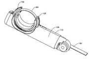 도 22는 도 21에서처럼 동일한 공간 관계의 근위 및 원위 가이드(120, 130)를 예시한다. 근위 가이드(120)의 도면이 도 23(A) 내지 도 23(B)에 도시되어 있다. 가이드(120, 130)는 바람직하게는 일련의 금속 하위구성성분을 조립하여, 예컨대 레이저 용접에 의해 금속 물질로부터 제조되고, 일단 조립되면 통합되고 일체형이다. 가이드는 드라이브 멤버(150)에 접하는 "상면" 및 하우징 부분(108)에 접하는 "하면"을 갖는 것으로 생각될 수 있다. 근위 가이드(120)는 이의 상면(122)에서 곡선 채널(125)을 획정한다. 근위 가이드(120)는 내부에 획정된 홈(124b)을 갖는 하면(124), 가드(109)의 내부 표면을 지탱하는 내면(126) 및 하우징 구성성분(106, 108)을 지탱하는 외면(128)을 추가로 획정한다. 도 24(A) 내지 도 24(B)에 예시된 바대로, 원위 가이드(130)는 멈춤쇠(160)를 가이드하기 위해 이의 상면(132)에서 곡선 채널(135)을 획정한다. 원위 가이드(130)는 내부에 획정된 홈(134b)을 갖는 하면(134), 가드(109)의 내부 표면을 지탱하는 내면(136) 및 하우징 구성성분(106, 108)을 지탱하는 외면(138)을 추가로 획정한다.Figure 22 illustrates the same spatial relationship of the proximal and