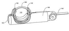 봉합 헤드(100)의 예시적인 조작 방법이 도 123 내지 도 131에 기재되어 있다. 도 123은 가이드(120, 130)가 견인된 전달 구성에서 니들(300)이 내부에 배치된 봉합 헤드(100)의 단면도를 예시한다. 니들(300)은 장치(1000) 내에 완전 포함되고, 멈춤쇠 스프링(115b)은 니들(300)이 시계반대 방향으로 이동하는 것을 막든다. 유사하게, 멈춤쇠 스프링(115a)은 니들의 내부 원주 표면(322)에 대해 바이어스되어, 니들이 시계 방향으로 이동하는 것을 막는 경향이 있다. 도 123 내지 도 131에 기재된 것처럼, 니들 트랙이 전개 조건에 있을 때, 상기 장치(1000)의 드라이브 시스템은 니들 트랙 주위의 다회의 360° 회전으로 니들(300)을 전진시키도록 구성되고 적합한 것이 명확하다. 니들 트랙이 전개 전 각 정도는 약 180°이고, 전개 후 각 정도는 180° 초과인 것이 추가로 명확하다.An exemplary operation method of the sealing