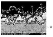 템퍼링 온도가 500℃∼700℃ 미만인 경우, 아연 도금층은, 면적률로 0∼70%의 고용체층(고Zn 고용체상으로 이루어짐)(10)과, 면적률로 30% 이상의 라멜라층(40)을 함유하였다.When the tempering temperature is less than 500 캜 to 700 캜, the zinc plating layer is formed by a solid solution layer (consisting of a high Zn solid solution phase) 10 of 0 to 70% in area ratio and a