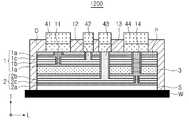 다음, 제12 실시예에 따른 다층 박막 커패시터 (1200) 는 제2 외부단자 (42) 와 제3 외부전극 (43) 이 서로 스플릿 (split) 되어서, 모두 4 개의 외부단자 (41, 42, 43, 44) 를 가진다.Next, in the multilayer