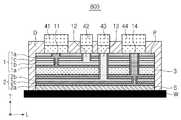 상기 제1 외부단자 (41) 는 제1 적층 바디의 제1 내부전극층 (1a) 과 전기적으로 연결되도록 형성된다. 상기 제1 외부단자와 상기 제1 내부전극층 간의 연결은 제1 비아 (11) 를 통해 이루어지며, 상기 제1 비아는 제1 외부단자로부터 제1 적층 바디의 최하층 제1 내부전극층까지 관통하도록 배치된다.The first