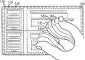 도 12b는 큰 정도의 핀치 인 제스처의 최종 결과로서 손가락들의 닫힌 자세(510)를 보여준다.  큰 정도의 핀치 인 제스처는 예컨대, 터치 기능 스크린(110) 상에서 열린 자세(520)(도 12a)에서 닫힌 자세(510)로의 엄지 및 검지의 큰 정도의 전환으로 이루어진다.  상기 전환은 예컨대, 도 11a-11b의 전환 시 일어나는(즉, 거의 같은 속도로 일어나는) 살짝 닫힌 자세(140)에서 살짝 열린 자세(130)로의 손가락들의 전환과 거의 같은 시간 동안 일어난다.  큰 정도의 핀치 인 제스처의 결과로서, 이미지 데이터 영역(315)은 이미지 데이터의 심볼 수준 추상 개념(도 12a의 이미지 데이터의 사진 수준으로부터 요약됨)을 보여주며, 메타데이터 영역(320)은 온라인 검색 결과들의 주제 수준의 추상 개념에 대응하는 메타데이터의 헤딩 수준 추상 개념(도 12a의 메타데이터의 구 수준 추상 개념으로부터 요약됨)을 보여준다.FIG. 12B shows the