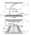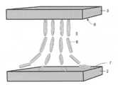 도 2는 변전 효과를 기반으로 한 선행 기술에 따른 HAN 셀의 원리를 도시하고 있다.  HAN 셀에서, LC 분자들(6)은 하나의 표면(7)에서는 그 표면(7)과 평행하게 배향되고, 다른 표면(8)에서는 그 표면(8)과 수직으로 배향된다.  액정 분자들(6)의 분자 형태가 적절하다면, 그러한 배향에 의해 변전 효과에 의한 편광이 발생한다.  그 경우, 인가된 전압(V)의 부호에 의존하는 액정 분자들(6)의 광축의 회전 방향이 나타난다.FIG. 2 shows the principle of a HAN cell according to the prior art based on the transformation effect. In the HAN cell, the
