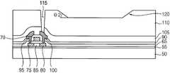 예시적인 실시예들에 있어서, 층간 절연막(90)을 부분적으로 식각하여 소스 및 드레인 영역(75, 80)을 부분적으로 노출시키는 홀들을 형성한 후, 이러한 홀들을 채우면서 층간 절연막(90) 상에 제2 도전막(도시되지 않음)을 형성한다. 다음에, 상기 제2 도전막을 패터닝하여 도 7에 예시적으로 도시한 바와 같은 소스 및 드레인 전극(95, 100)을 형성한다. 상기 제2 도전막은 스퍼터링 공정, 화학 기상 증착 공정, 펄스 레이저 증착 공정, 진공 증착 공정, 원자층 적층 공정, 프린팅 공정 등을 이용하여 수득될 수 있다. 소스 및 드레인 전극(95, 100)은 각기 금속, 합금, 금속 질화물, 도전성 금속 산화물, 투명 도전성 물질 등을 포함할 수 있다. 예를 들면, 소스 및 드레인 전극(95, 100)은 각기 알루미늄, 알루미늄을 함유하는 합금, 알루미늄 질화물, 은, 은을 함유하는 합금, 텅스텐, 텅스텐 질화물, 구리, 구리를 함유하는 합금, 니켈, 크롬, 크롬 질화물, 몰리브데늄, 몰리브데늄을 함유하는 합금, 티타늄, 티타늄 질화물, 백금, 탄탈륨, 탄탈륨 질화물, 네오디뮴, 스칸듐, 스트론튬 루테늄 산화물, 아연 산화물, 인듐 주석 산화물, 주석 산화물, 인듐 산화물, 갈륨 산화물, 인듐 아연 산화물 등으로 이루어질 수 있다. 이들은 단독으로 또는 서로 조합되어 사용될 수 있다. 한편, 소스 및 드레인 전극(95, 100)은 각기 전술한 금속, 합금, 금속 질화물, 도전성 금속 산화물, 투명 도전성 물질 등으로 이루어진 단층 구조 또는 다층 구조를 가질 수 있다.In the illustrative embodiments, the