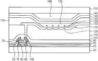 층간 절연막(90) 상에 소스 및 드레인 전극(95, 100)이 형성됨에 따라, 제1 기판(50) 상에는 상기 유기 발광 표시 장치의 스위칭 소자로서 반도체 패턴(60), 게이트 절연막(65), 게이트 전극(70), 소스 전극(95) 및 드레인 전극(100)을 포함하는 박막 트랜지스터(TFT)가 제공된다.The source and drain