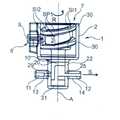 피스톤(3)의 대 직경 원통형부(15)는 보어(7)의 직경보다 작은 외부 직경을 나타내어 수납될 수 있다. 대 직경 원통형부(15)의 자유 단부는 중공체(2)에 대해 피스톤(3)을 회전하기 위한 구동 수단에 연결되는 상보적인 형상의 엔드피스(나타나지 않은)를 수용하기 위해 크로스 형상(도 5에서 알 수 있는 바와 같이)인 리세스 형상(18)을 나타낸다. 리세스 형상(18)은 회전 구동에 적절한 임의의 다른 프로파일을 가질 수 있고, 또한 릴리프부로서 제공될 수 있다. 그러나, 리세스 형상은 접근성이 적은 이점을 나타내어, 피스톤(3)의 위치가 회전-진동 서브어셈블리(1)를 사용하기 전에 수동으로 덜 쉽게 변경된다. 따라서, 그 첫번째 사용으로부터, 피스톤의 위치는 알고 있으므로, 초기 가동시 피스톤의 작동 스테이지를 확실하게 할 수 있고, 따라서 전송된 투여량을 정확하게 알 수 있다. 동일한 이유로, 리세스 형상은 작동되기 위해 특정 도구의 사용을 요구하도록 디자인될 수 있다. 피스톤(3)의 대 직경 원통형부(15)는 서로 평행한 두 개의 환상 리브(30)를 포함하여 그들 사이에서 가이드 핑거(9)를 가이딩하기 위한 듀얼 가이드 캠을 규정한다. 따라서, 가이드 핑거(9)에 대해 회전하는 어떤 위치에서도, 환상 리브(30) 사이의 종 방향의 스페이싱은 가이드 핑거(9)의 치수에 조절되어 간극 없이 또는 초과 간극 없이 가이딩을 가능하게 한다. 또한, 가이드 핑거(9)는 환상 리브(30)에 대해 롤링하는 회전부가 제공될 수 있어서, 마찰을 감소시킨다. 따라서 에너지 효율성은 최적화된다. 환상 리브(30)의 각 리브는 종 방향 중앙 평면에서 서로가 대칭인 제 1 경사부 및 제 2 경사부(SI1, SI2)를 포함한다. 따라서, 제 1 경사부 및 제 2 경사부(SI1, SI2)는 피스톤(3)의 주변부에서 대향하는 경사를 나타낸다. 제 1 경사부 및 제 2 경사부(SI1, SI2)는 서로가 실질적으로 평행이며 종축(A)에 수직인 제 1 및 제 2 평면부(SP1, SP2)에서 서로가 떨어져서 이간된다. 따라서, 가이드 핑거(9)와 환상 리브(30)에 의해, 피스톤(3)이 제 1 회전 방향(R)으로 중공체(2)에 대해 회전됨으로써, 연속으로 피스톤(3)이 제 1 경사부(SI1)를 따라 제 1 이동 방향(T1)으로 중공체(2)에 대해 축 방향으로 이동되게 되고, 그 뒤에 제 2 경사부(SI2)를 따라 제 2 이동 방향(T2)으로 축 방향으로 중공체(2)에 대해 이동되게 되고, 뒤에 최종적으로 제 2 평면부(SP2)를 따라 중공체(2)에 대해 축 방향으로 정지되게 되는 등 한다. 따라서, 피스톤(3)은 작동 챔버(31)가 최대 용적을 나타내는 높은 위치(도 8과 비교)와 작동 챔버(31)가 최소 부피를 나타내는 낮은 위치 사이에서 왕복 운동을 한다. 피스톤(3)의 두 위치 사이에서, 작동 챔버(31)는 유체를 투입한 후 배출한다.The large-diameter