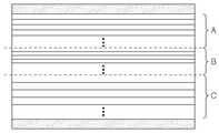 도 6은 본 발명의 바람직한 다른 일실시예에 따른 다층 반사형 편광자의 단면도이다. 이를 상기 도 5와의 차이점을 중심으로 설명하면 코어층 내부에 평균 광학적 두께가 상이한 3개 그룹들(A, B, C)이 형성되며 각각의 그룹간 반복단위들의 평균 광학적 두께가 상이하다.6 is a cross-sectional view of a multilayer reflective polarizer according to another embodiment of the present invention. 5, three groups (A, B, and C) having different average optical thicknesses are formed in the core layer, and the average optical thicknesses of the inter-group repeating units are different from each other.