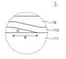 또한, 상기 감광성 고분자 유기물층(112)은 상기 표시 영역(DA)에 인접한 에지부가 테이퍼진 형상을 가질 수 있다. 여기서, 상기 에지부의 테이퍼각(θ)은 20° 내지 70°일 수 있다. 또한, 상기 에지부의 폭(W)은 3㎛ 내지 15㎛일 수 있다.In addition, the photosensitive polymer