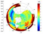 대기평가함수는 수평거리 242 nmi, 방위각 319도에서 10.2 kft로 최댓값을 가지며, 수평거리 170 nmi, 방위각 223도에서 -8.3 kft로 최솟값을 가진다. 대기평가함수의 분포로부터 청색 농도가 짙은 곳에서는 아굴절, 적색 농도가 짙은 곳에서는 초굴절이 발생하는 것을 알 수 있다.The atmospheric evaluation function has a maximum value of 10.2 kft at a horizontal distance of 242 nmi, an azimuth angle of 319 degrees and a minimum value of -8.3 kft at a horizontal distance of 170 nmi and an azimuth angle of 223 degrees. From the distribution of the atmospheric evaluation function, it can be seen that the sub-refraction occurs in the place where the blue color density is high, and in the place where the red color density is dark.