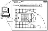 도 1b는 스마트폰(108)이 스마트폰(108) 상의 웹 브라우저의 지도 애플리케이션에서 지도 자체를 보여주는, 나중 시점의 스마트폰(108)을 나타낸다. 일부 예시들에서, 스마트폰(108)은 스마트폰(108)에 설치된 독립적인 지도 애플리케이션에서 상기 지도를 보여준다. 도 1b에 도시된 예시에서, 스마트폰(108) 상의 URI 110은 컴퓨터 모니터(102)상에 디스플레이 된 URI 112에 매칭된다. 그와 같은 매치는 스마트폰(108) 상의 이미지 또는 스마트폰(108)이 통신중인 서버 시스템을 분석하고, 브라우저 주소 박스(browser address box)가 상기 이미지에 존재한다는 것을 인식하고, 상기 박스의 문자들에 대한 광학 문자 인식(optical character recognition)을 수행함으로써 생성될 수 있다. 단독으로(또는 서버 시스템으로부터의 도움으로) 상기 작업(work)을 수행하는 스마트폰(108)에 대한 대안으로서, 컴퓨터(100)도 스마트폰(108)으로 컴퓨터(100)의 상태를 가져오는 프로세스를 지원하기 위해 위탁될 수도 있다. 그와 같은 시스템에서, 아래에서 더 자세히 논의되겠지만, 컴퓨터(100) 및 스마트폰(108)은 텍스트 메시징 기능을 포함하는 공통의 온라인 서버 시스템에 인증되거나 로그인 될 수 있다. 스마트폰(108)은 이제 컴퓨터(100)로부터 캡쳐된 디지털 이미지를 텍스트 메시지로 패키지(package) 할 수 있고 상기 이미지를 컴퓨터(100)로 보낼 수 있다. 컴퓨터(100)는 이제 상기 이미지를 사용자가 컴퓨터 모니터(102)로부터 무엇을 캡쳐하였는지, 따라서 사용자가 복제(replicate)하고 싶어하는 애플리케이션과 상태를 판단하기 위해 이용할 수 있다. 컴퓨터(100)는 수신된 이미지를 현재 컴퓨터 모니터(102) 상에 디스플레이 되고 있는 이미지에 비교하고, 매치되는 점을 찾고(look for a match), 그러고 나서 상기 매치에 의해 대표되는 애플리케이션을 식별할 수 있다. 컴퓨터(100)는 이제, 웹 브라우저 애플리케이션으로부터 현재 URI를 획득하는 등에 의해, 애플리케이션의 현재 상태를 판단할 수 있다.1B shows a