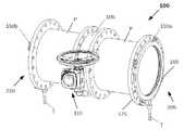 본 발명의 다른 구체예에서, 각각의 제 1 및 제 2 평형링은 환형체의 외부 가장자리 부분에서 구성된 부착 수단(attachment means, 165)에 의해 업스트림 말단 및 다운스트림 말단에 결합된다.In another embodiment of the present invention, each first and second balancing ring is coupled to the upstream end and the downstream end by attachment means 165 configured at the outer edge portion of the annulus.