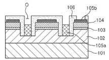다음으로, 도 10(평면도) 및 도 11(단면도)에 도시된 것과 같이, 제2 도전형 반도체층(104) 상에 제2 내부 전극(105b)을 형성하며, 이후, 도 12에 도시된 것과 같이, 그루브(G)와 제1 및 제2 내부 전극(105a, 105b)을 덮도록 절연부(106)를 형성한다. 본 단계에서, 절연부(106)는 소자의 상면 전체를 덮도록 형성될 수 있으며, 실리콘 산화물이나 실리콘 질화물 등과 같은 절연 물질을 증착, 스핀 코팅 등의 방법으로 얻어질 수 있다. 이후, 도 13(평면도) 및 도 14(단면도)에 도시된 것과 같이하고 절연부(106)에 오픈 영역(O)을 형성하여 제1 및 제2 내부 전극(105a, 105b)의 적어도 일부 영역을 노출시킨다. 이 경우, 상술한 바와 같이, 제1 내부 전극(105a)은 컨택 영역(C)에 해당하는 부분만이 노출될 수 있다. 다음으로, 도 15에 도시된 것과 같이, 제1 및 제2 내부 전극(105a, 105b)과 각각 연결되도록 제1 및 제2 패드 전극(107a, 107b)을 형성한다.