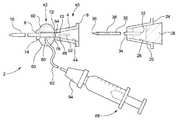 도 1 및 도 2를 참조하여, 대체로 도면부호 2로 지시된, 본 발명의 제1 실시예에 따른 디바이스가 도시되어 있다. 도 1 및 도 2에 도시된 디바이스(2)는 준비 위치에 있다. 도 3에 도시된 디바이스는 니들이 근위 방향으로 인출된 후퇴 위치에 있다.Referring to Figures 1 and 2, a device according to a first embodiment of the present invention, indicated generally by the