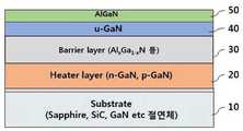 도 2를 참조하면, 본 발명의 실시예에 따른 히터 구조를 구비한 질화갈륨계 센서 제조를 위한 에피택시 박막은, 기판(10)과; 기판에 성장되는 n 타입 또는 p타입 GaN 층(20)과; n 타입 또는 p타입 GaN 층 상에 성장되는 GaN (AlxGa1-xN, InxAl1-xN, 고저항 GaN 포함) 기반의 단층 또는 다층으로 이루어진Barrier 층(30)과; Barrier 층(30) 상에 성장되는 u-GaN 층(40)과; u-GaN 층 상에 성장되는 AlxGa1-xN층, InxAl1-xN층 및 InxAlyGa1-x-yN층으로 이루어지는 군에서 선택되는 1종의 층(50)으로 성장될 수 있다. 여기서, 기판(10)은 사파이어, AlN, Diamond, BN, SiC, Si및 GaN로 이루어지는 군에서 선택되는 어느 하나의 재료로 만들어질 수 있다.Referring to FIG. 2, an epitaxial thin film for manufacturing a gallium nitride-based sensor having a heater structure according to an embodiment of the present invention includes a