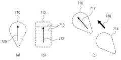 도 7의 (a)를 참고하면, 상기 제어부(120)는 접근 점들이 분포하는 접근 영역(710)의 외곽 형태에 근거하여 사용자 입력 수단의 접근 방향 벡터(720)를 산출한다. 저장부(140)에는 사용자 입력 수단이 가질 수 있는 접근 영역의 패턴들이 저장되어 있으며, 상기 제어부(120)는 패턴 매칭을 통해 접근 방향 벡터를 산출할 수 있다. 즉, 상기 제어부(120)는 저장부(140)에 미리 저장된 접근 영역의 패턴들 중에서 상기 감지된 접근 영역과 유사한 패턴을 검출하고, 상기 검출된 패턴에 미리 정의된 접근 방향 벡터를 상기 감지된 접근 영역의 방위에 맞추어 회전함으로써 상기 감지된 접근 영역의 접근 방향 벡터를 산출할 수 있다. 이러한 접근 방향 벡터는 상기 감지된 접근 영역의 크기(또는 길이)에 대응되는 크기를 갖거나, 1과 같은 단위 크기를 가질 수 있다. 본 발명에서, 접근 방향 벡터의 산출은 사용자 입력 수단의 접근 방향을 결정하기 위한 하나의 수단으로서 예시되는 것이고, 접근 방향 벡터를 반드시 산출해야 하는 것은 아님에 주의해야 한다.Referring to FIG. 7A, the