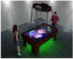 본 발명에 있어서, 상기 영상 출력부는, 상기 제어부의 제어에 따라, 에어하키 테이블 상에 사용자가 선택한 배경영상을 상부에서 투사하는 방식으로 출력하고, 또한 각 진영에 관련된 정보를 해당 진영의 사용자에게만 보이도록 표시하기 위한 서브 모니터를 포함하는 것을 특징으로 한다.According to the present invention, the image output unit outputs the background image selected by the user on the air hockey table in a manner of projecting from the top in accordance with the control of the control unit, and also displays information related to each faction to only the user of the faction And a sub-monitor for displaying the sub-monitor.