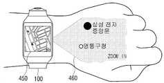 또한, 상기 웨어러블 디바이스는, UI 화면을 디스플레이하는 스마트 와치(smart watch) 디바이스로 구현되며, 상기 프로세서는, 상기 스마트 와치 디바이스가 착용된 손목 영역을 기준으로 전방향 촬영된 영상에서 사용자의 신체 영역을 상기 타겟 영역으로 검출하며, 상기 UI 화면을 상기 사용자의 신체 영역의 형상에 대응되도록 재구성한 가상 UI 화면을 상기 검출된 신체 영역에 투사하도록 제어할 수 있다.The wearable device may be implemented as a smart watch device displaying a UI screen, and the processor may detect a body region of the user from an image captured in all directions based on a wrist region on which the smart watch device is worn. The target UI may be detected and the virtual UI screen reconfigured to correspond to the shape of the user's body region may be projected onto the detected body region.
