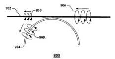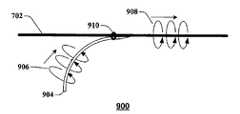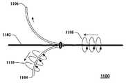 예를 들면, 이러한 원형이 아닌 필드 분포들은 비교적 큰 필드 세기를 특징으로 하는 하나 이상의 축 방향 로브들 및/또는 비교적 작은 필드 세기, 제로-필드 세기, 또는 실질적으로 제로-필드 세기를 특징으로 하는 하나 이상의 널들 또는 널 영역들을 갖는 일측성(unilateral) 또는 다측성(multi-lateral)일 수 있다. 또한, 필드 분포는 그와 달리 와이어 주위의 하나 이상의 각도 방향들이 일 예시적인 실시예에 따라, 방위각 방향의 하나 이상의 다른 각도 영역들보다 큰 전기장 또는 자기장 세기(또는 그의 조합)를 갖도록 와이어 주위의 방위각 방향의 함수로서 변할 수 있다. 가이드파 고차 모드들 또는 비대칭 모드들의 상대적인 방향들 또는 위치들이 가이드파가 와이어를 따라 이동함에 따라 변할 수 있다는 것이 이해될 것이다.For example, these non-circular field distributions may be one or more axial lobes characterized by relatively large field strength and / or one characterized by relatively small field strength, zero-field strength, or substantially zero-field strength. It may be unilateral or multi-lateral with the above nulls or null regions. Further, the field distribution may otherwise have an azimuth angle around the wire such that one or more angular directions around the wire have a greater electric or magnetic field strength (or combination thereof) than one or more other angular regions in the azimuthal direction, according to one exemplary embodiment. It can change as a function of direction. It will be appreciated that the relative directions or positions of the guide wave higher order modes or asymmetric modes may change as the guide wave moves along the wire.